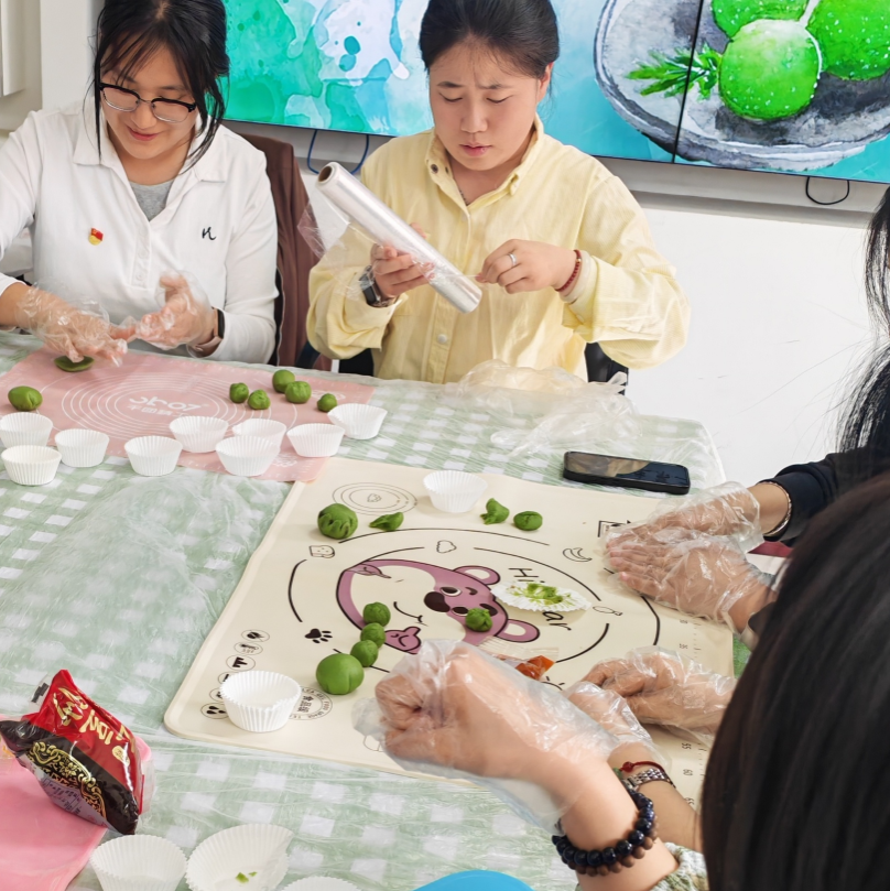 在动手实践环节,支部党员现场示范青团制作流程,从热水和面、分剂包馅到塑形摆盘,步骤清晰、讲解细致。