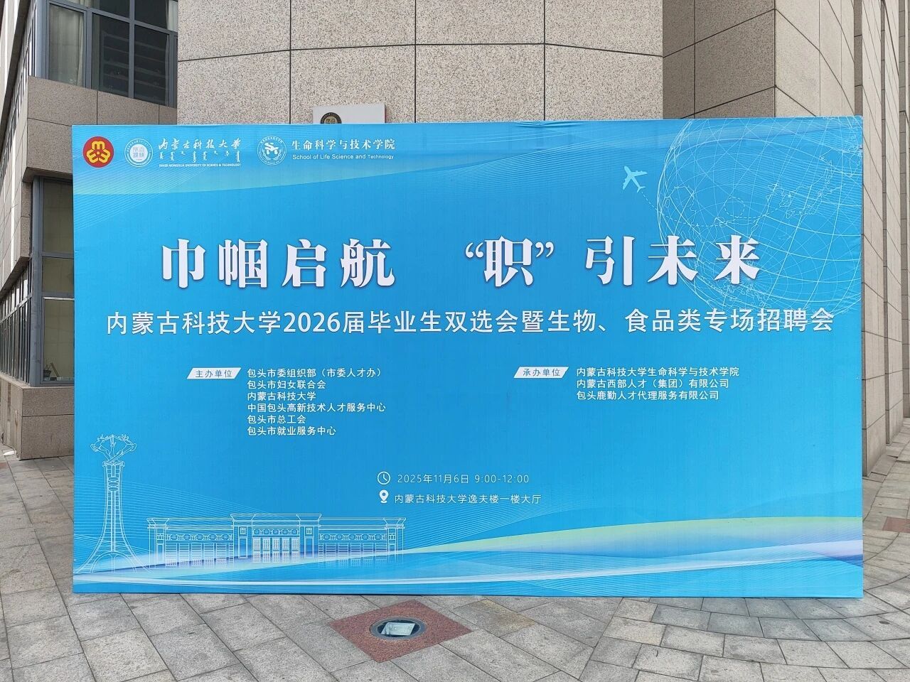 11月6日,由包头市委组织部(市委人才办)、包头市妇女联合会、内蒙古科技大学、包头市总工会、中国包头高新技术人才服务中心、包头市就业服务中心主办,内蒙古科技大学生命科学与技术学院、 内蒙古西部人才(集团)有限公司等承办的“巾帼启航 ‘职’引未来”——内蒙古科技大学2026届毕业生双选会暨生物、食品类专场招聘会在学校逸夫楼一楼大厅成功举办。