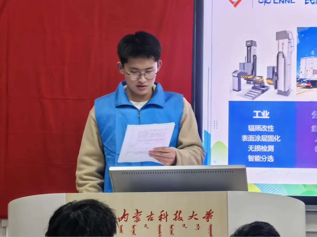 宣讲邀请矿业与煤炭学院“煤”好星辰志愿宣讲团成员刘晋甫担任主讲。刘晋甫从多领域视角出发,引导大家“感受”核技术在现实中的广泛应用,通过生动的技术演进故事、典型的行业案例与精彩的互动问答,呈现了一场兼具科学性与感染力的核技术科普盛宴。他系统讲解了核技术成像的基本原理与发展脉络,并深入介绍了其在工业制造、医疗健康、环境保护等多个领域的重要应用与实际成效。