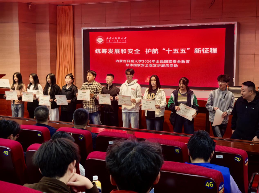 为深入学习贯彻总体国家安全观,迎接第十一个全民国家安全教育日,4月9日下午,我校举办以“统筹发展和安全,护航‘十五五’新征程”为主题的全民国家安全教育宣讲展示活动。活动中,学校对2026年内蒙古科技大学大学生践行总体国家安全观宣讲活动的获奖团队进行了表彰。