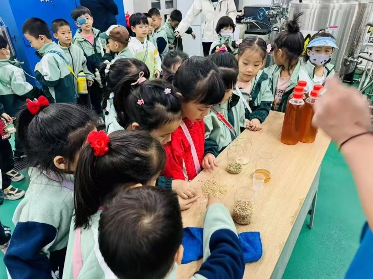 孩子们触摸观察啤酒发酵原料和设备