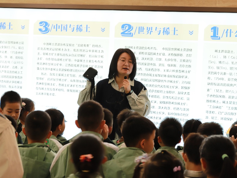 走进稀土产业学院的稀土产品展示厅,就像踏入了一个五彩斑斓的科学世界。赵烨老师如同知识渊博的导游,带领孩子们探索“工业维生素”稀土的奇妙应用。那些色彩斑斓的稀土矿石标本和互动模型,在赵老师的讲解下,成为了打开孩子们科学兴趣之门的钥匙。孩子们了解到稀土在电子设备、环保材料等众多领域的神奇作用,一个个眼神中满是对稀土元素“七十二变”的好奇与向往,探索科学的种子在他们心中悄然种下。