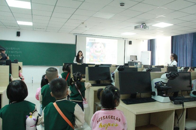 生命科学与技术学院腾飞楼D505是此次活动的重头戏所在。学生志愿者讲解员化身故事大王,通过趣味十足的PPT“小小微生物,大大奇妙行”,用生动形象的语言为孩子们讲述微生物的故事,让孩子们知道原来我们身边存在着数不清的微生物,而且这些微生物还有“好人”和“坏蛋”之分。随后,孩子们迫不及待地围在显微镜前,当他们透过显微镜,看到形态各异的微生物时,脸上满是惊叹与兴奋,“原来看不见的小生命如此多样!”